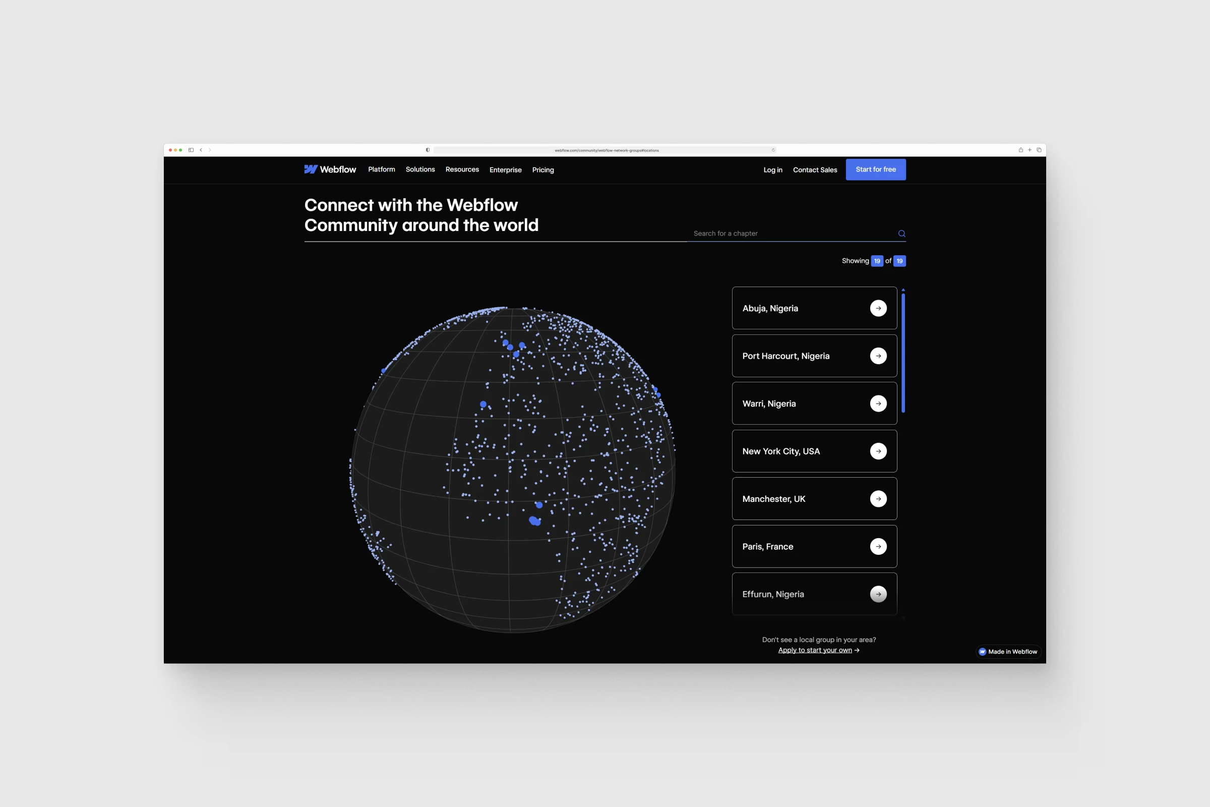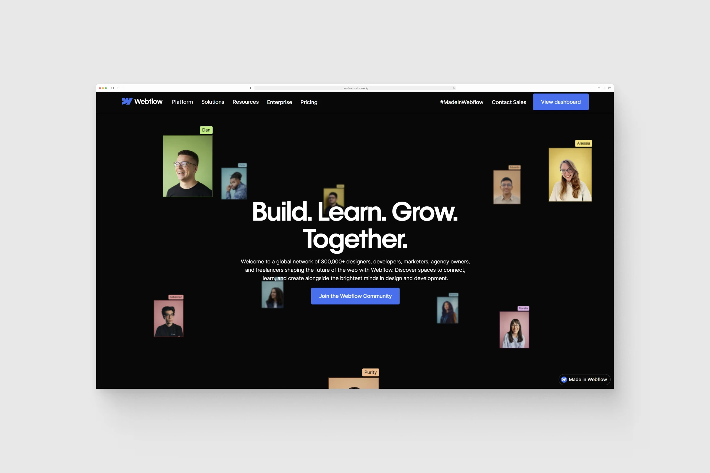 Webflow's Community Pages feature two custom interactive components: a Three.js globe and a CSS-perspective image carousel. Built with N4 Studio for Webflow's community hub, which serves as the central space for 300K+ designers, developers, and agency owners. I was brought in as a creative dev to build both components as reusable, CMS-driven Webflow elements.