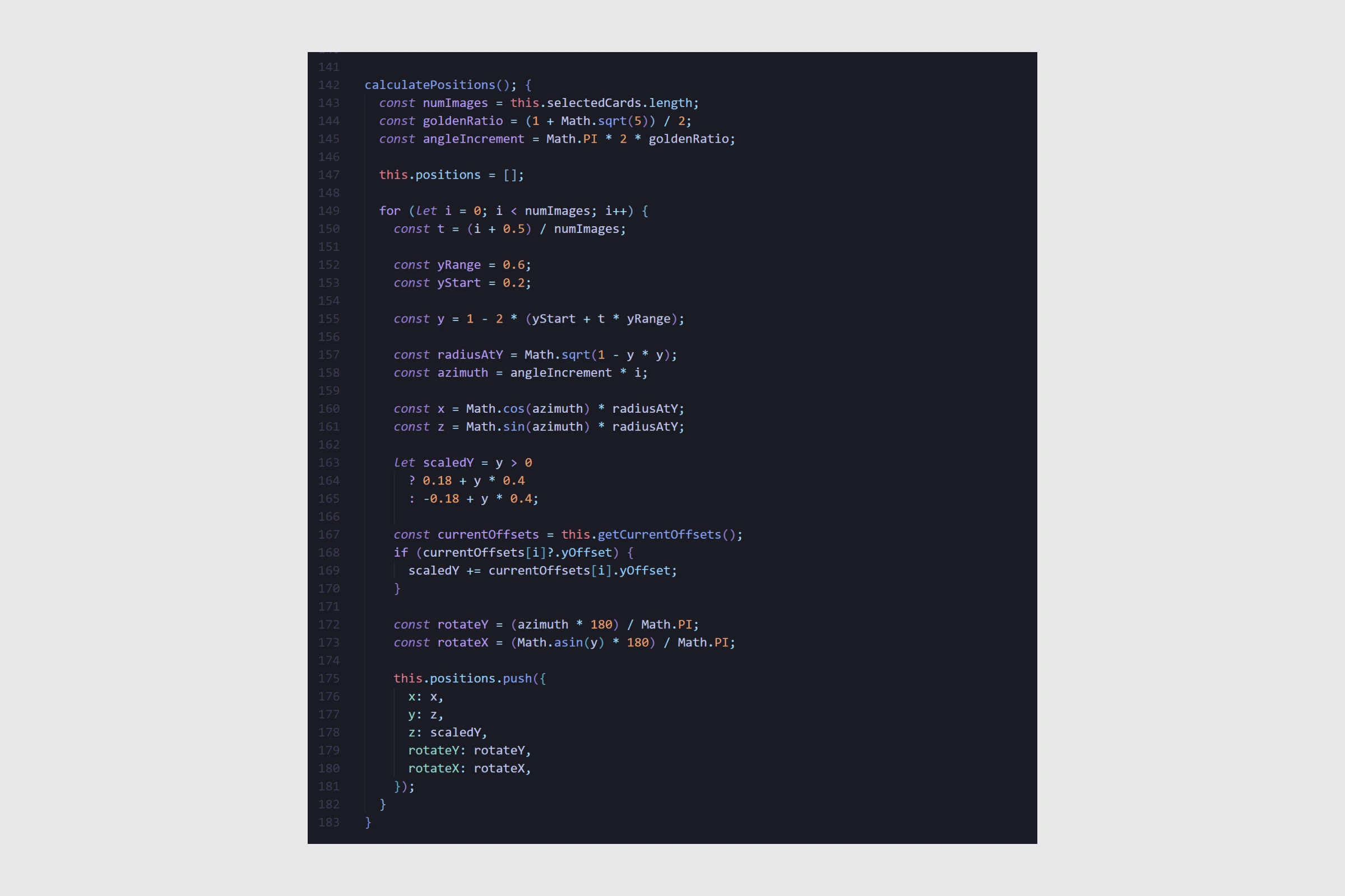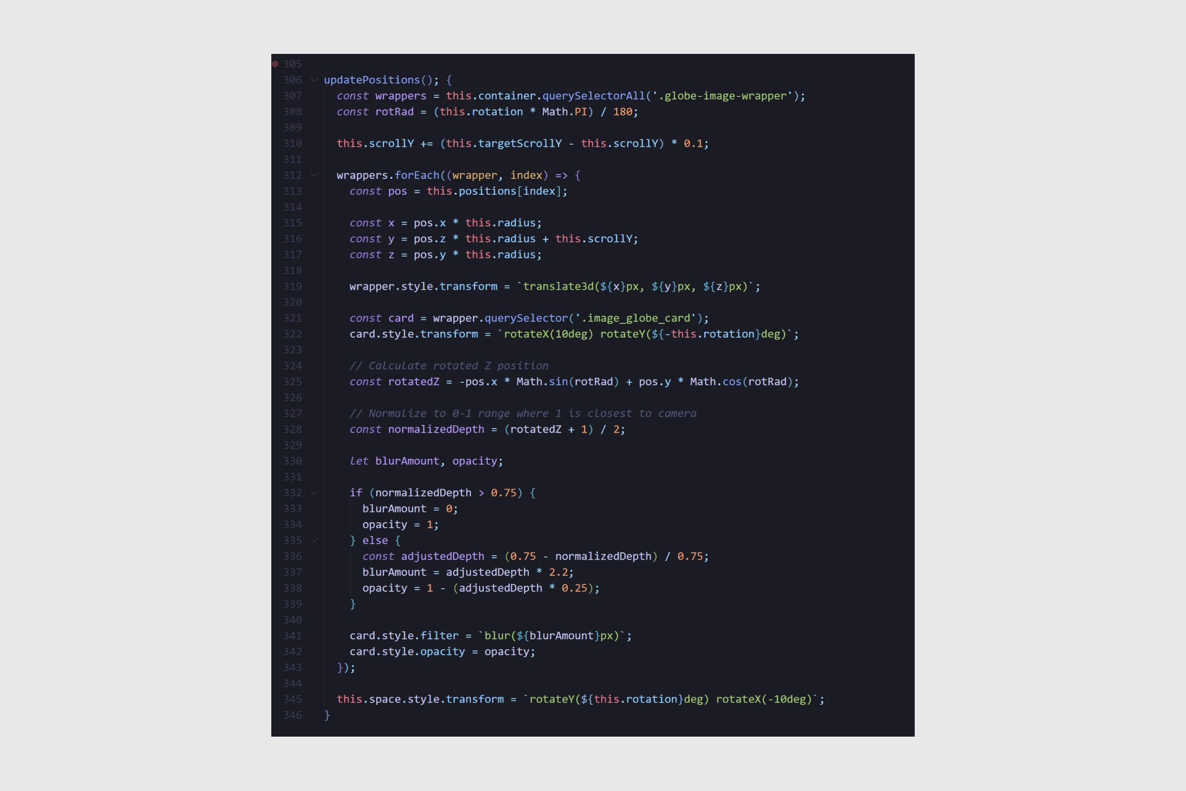 The hero image globe uses CSS perspective and transform-style: preserve-3d to create depth. Cards are distributed using golden ratio spacing, with per-breakpoint Y-offset tweaks for visual balance. Depth-based blur and opacity fade simulate distance. Drag interaction on desktop, scroll-driven parallax, and velocity-based momentum rounding it out. The whole thing reads from a hidden CMS list, clones the cards into 3D space, and respects data attributes for configuration.