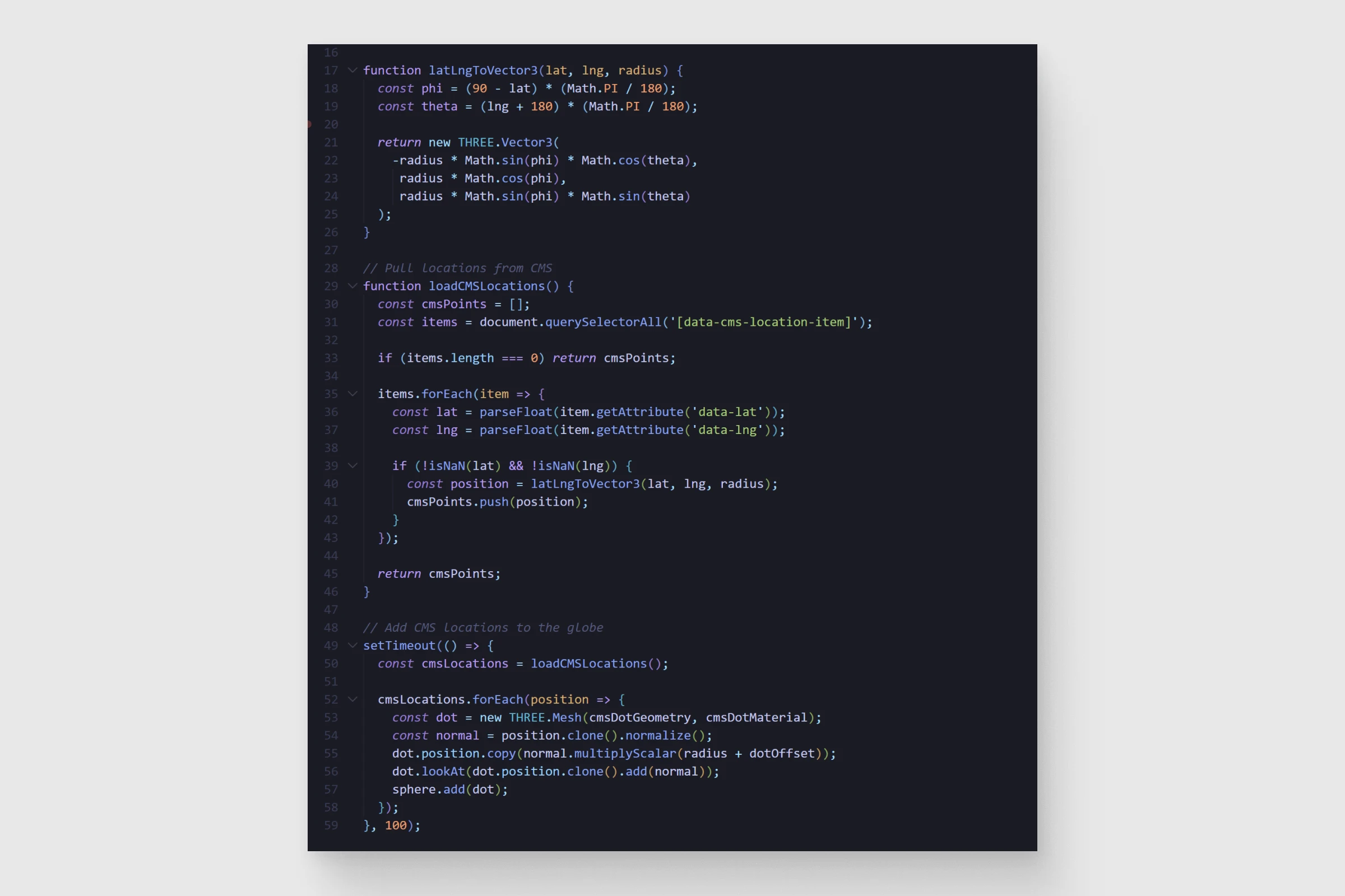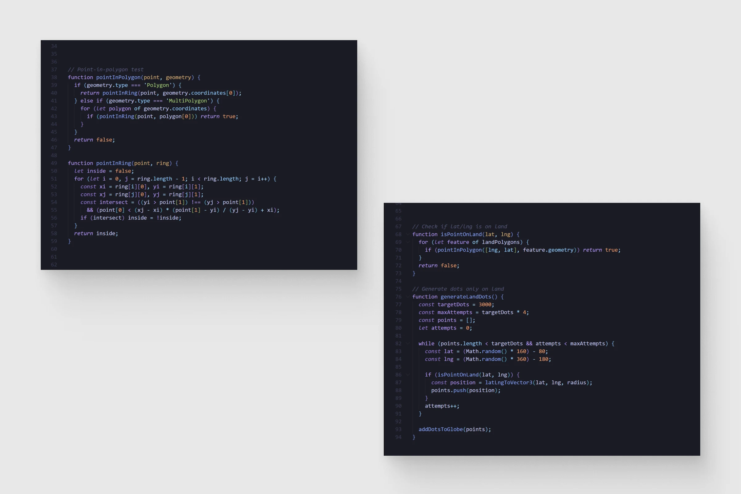 The Three.js globe fetches GeoJSON country boundaries and runs point-in-polygon tests to scatter dots only on land. CMS items with lat/lng attributes get plotted as highlighted points. OrbitControls handle grab interaction, with auto-rotation that pauses smoothly on user input. Performance considerations include IntersectionObserver-based lazy loading and reduced-motion support.